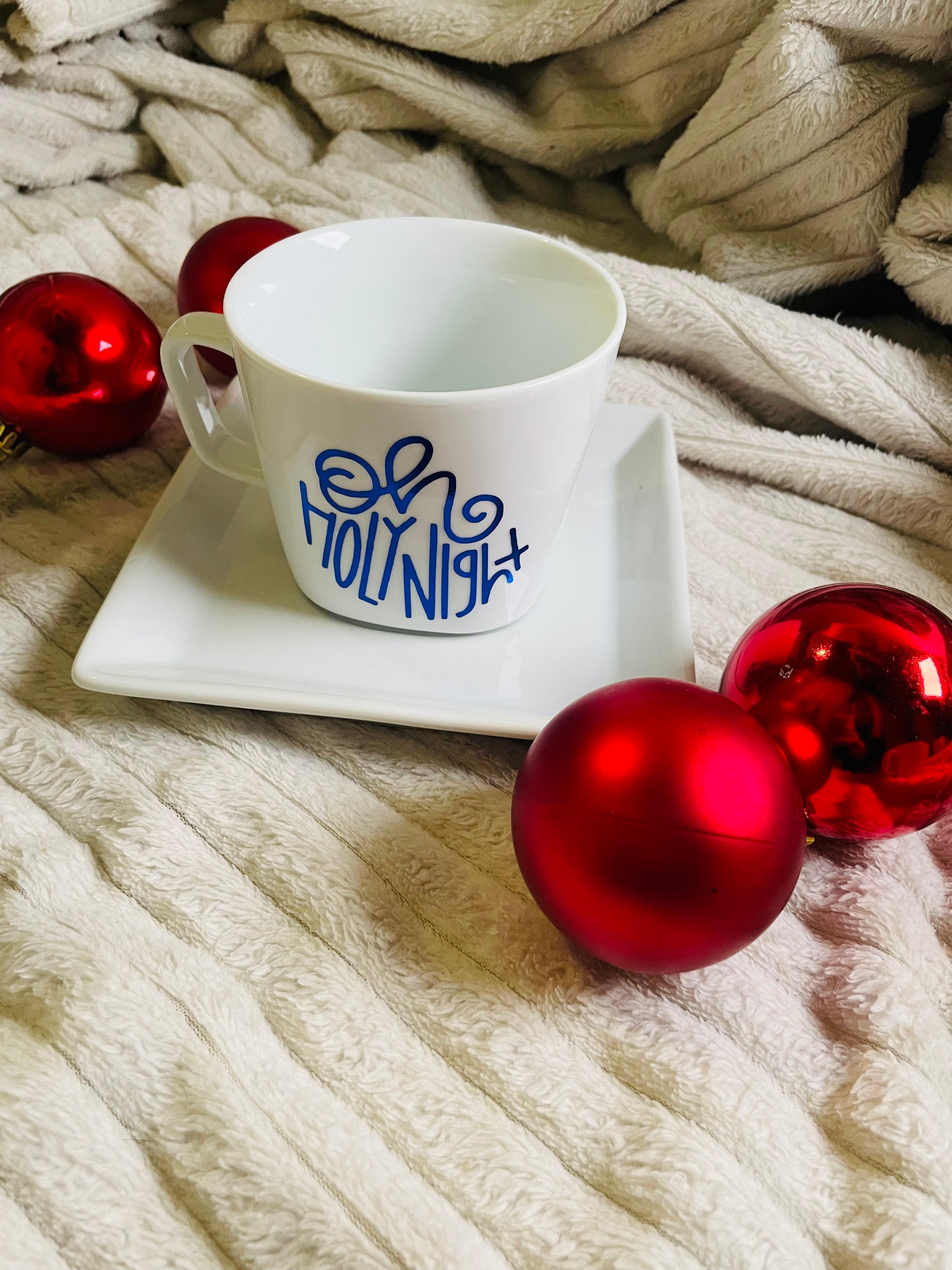 Mugg med fat med ”oh holy night” i blå metallisk text.