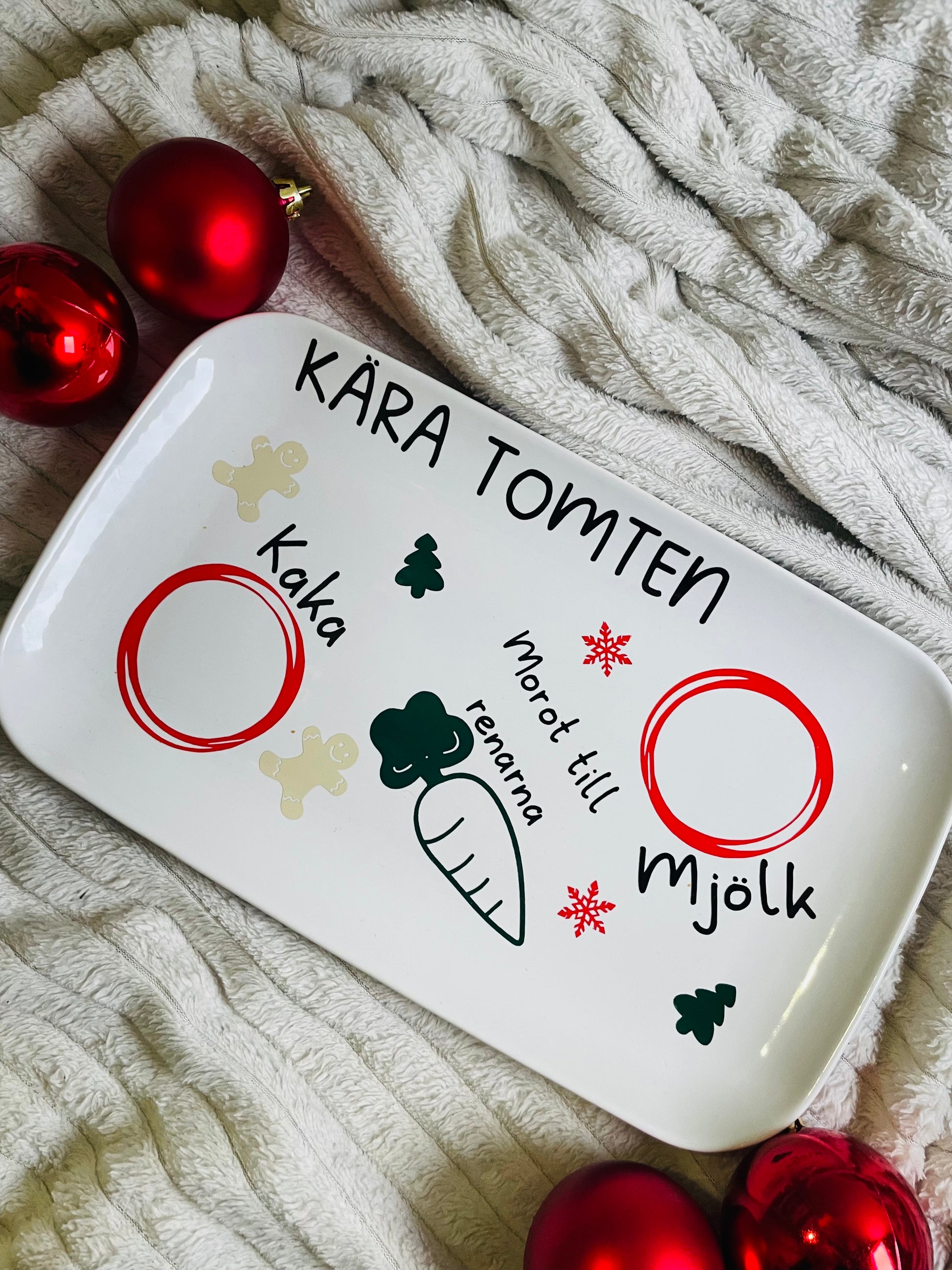 En söt tallrik med tryck, perfekt att ställa ut till tomten och renarna när dom kommer med julklappar.